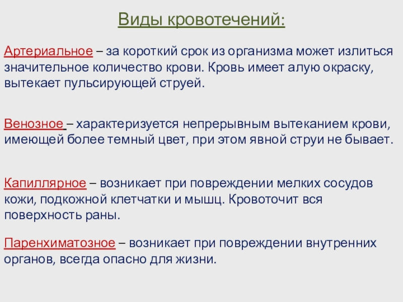 Капиллярное – возникает при повреждении мелких сосудов кожи, подкожной клетчатки и мышц. Кровоточит вся поверхность раны.
