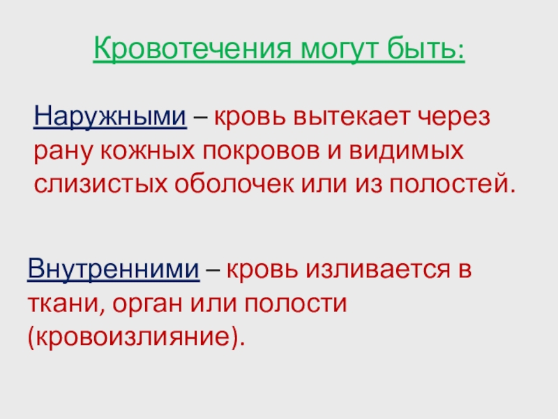 Внутренними – кровь изливается в ткани, орган или полости (кровоизлияние).
