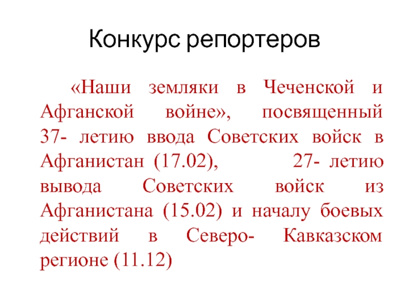 Конкурс репортеров  «Наши земляки в Чеченской и Афганской войне», посвященный   37- летию ввода Советских