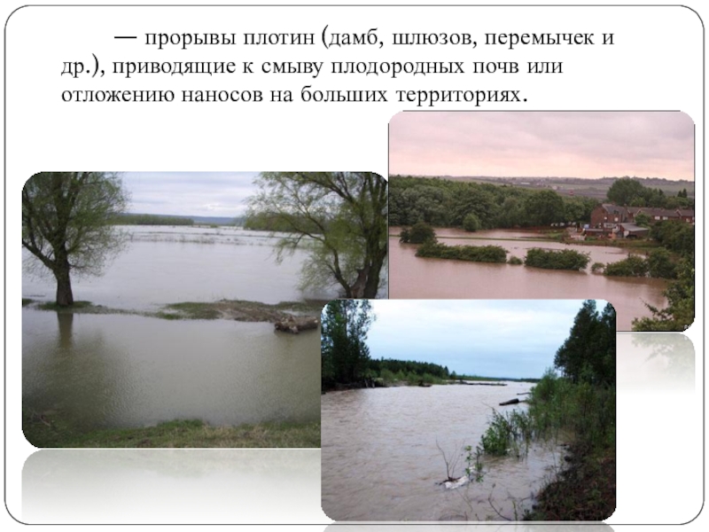 — прорывы плотин (дамб, шлюзов, перемычек и др.), приводящие к смыву плодородных почв или отложению наносов