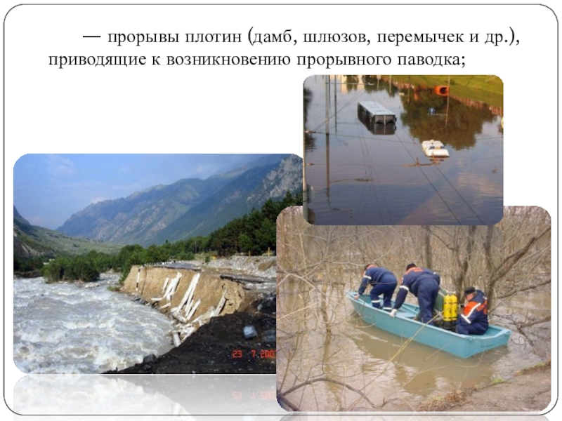 Слайд 5      — прорывы плотин (дамб, шлюзов, перемычек и др.), приводящие к