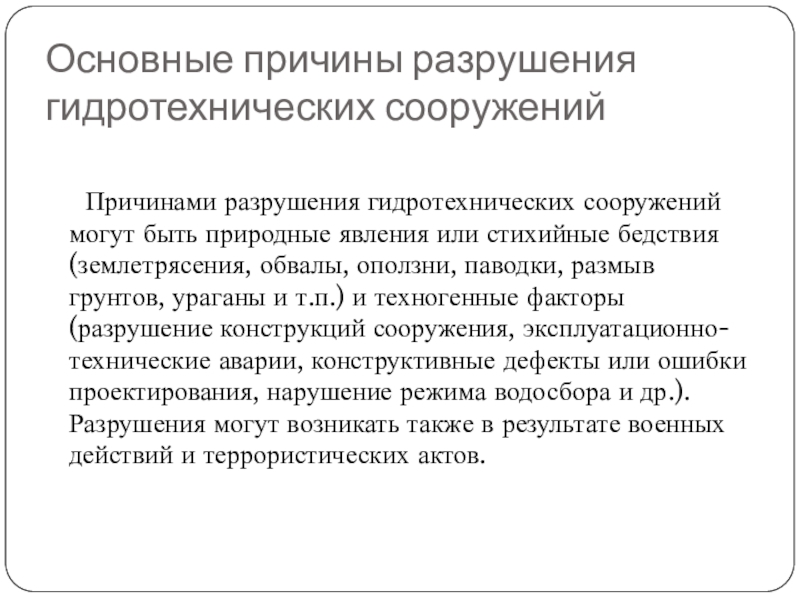 Основные причины разрушения гидротехнических сооружений	Причинами разрушения гидротехнических сооружений могут быть природные явления или стихийные бедствия (землетрясения, обвалы,