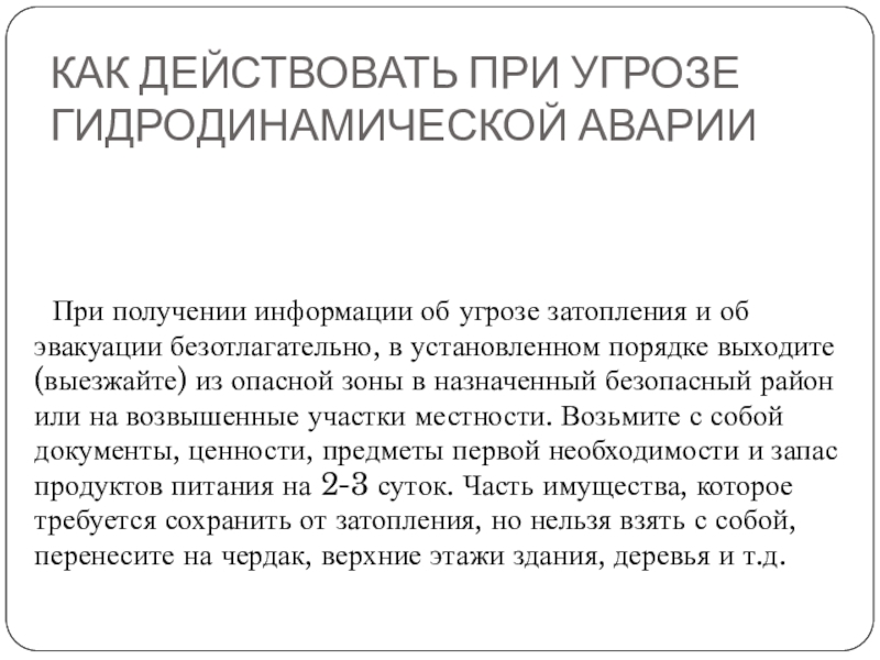 КАК ДЕЙСТВОВАТЬ ПРИ УГРОЗЕ ГИДРОДИНАМИЧЕСКОЙ АВАРИИ 	При получении информации об угрозе затопления и об эвакуации безотлагательно, в