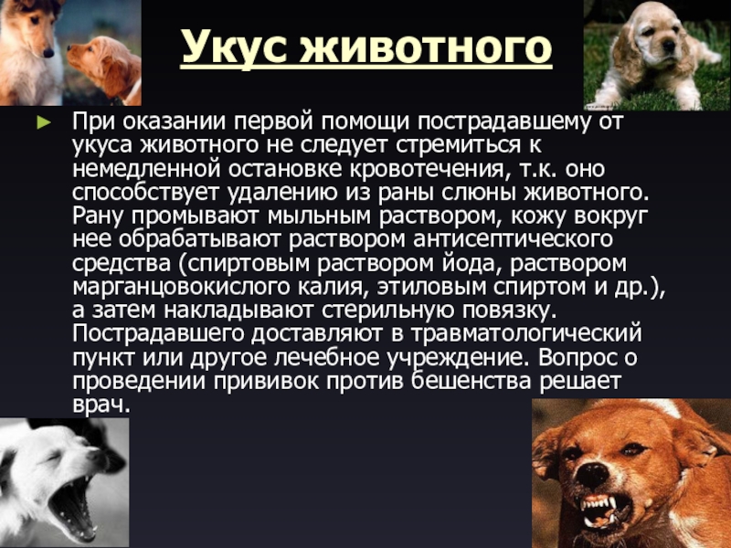 Укус животного При оказании первой помощи пострадавшему от укуса животного не следует стремиться к немедленной остановке кровотечения,