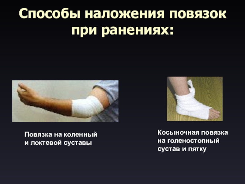 Способы наложения повязок при ранениях:Повязка на коленный и локтевой суставы Косыночная повязка на голеностопный сустав и пятку