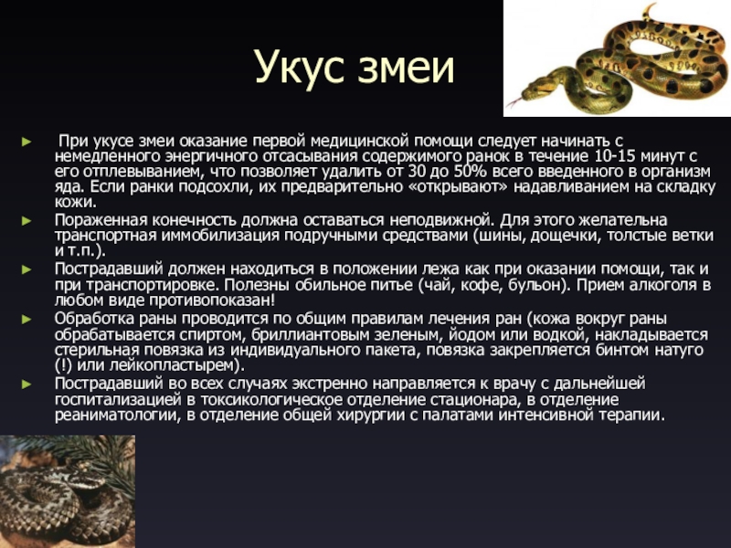 Укус змеи При укусе змеи оказание первой медицинской помощи следует начинать с немедленного энергичного отсасывания содержимого ранок