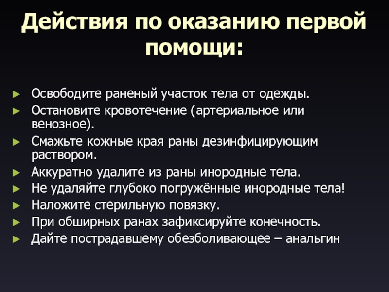 Действия по оказанию первой помощи:Освободите раненый участок тела от одежды. Остановите кровотечение (артериальное или венозное). Смажьте кожные