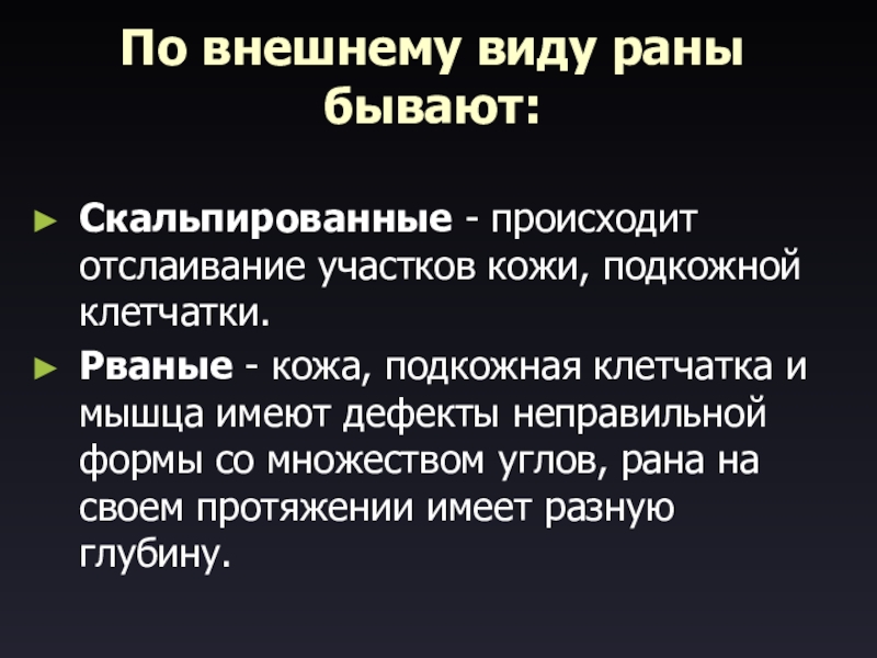 По внешнему виду раны бывают:  Скальпированные - происходит отслаивание участков кожи, подкожной клетчатки. Рваные - кожа,