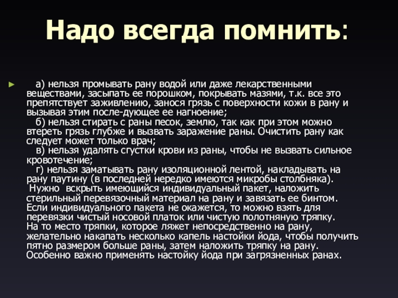 Надо всегда помнить:    а) нельзя промывать рану водой или даже лекарственными веществами, засыпать ее порошком, покрывать