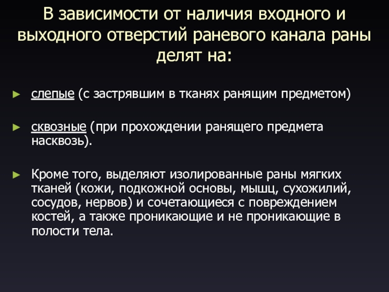 Слайд 7В зависимости от наличия входного и выходного отверстий раневого канала раны