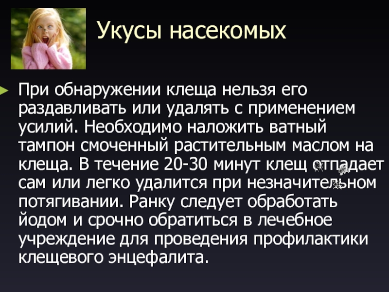 Укусы насекомых При обнаружении клеща нельзя его раздавливать или удалять с применением усилий. Необходимо наложить ватный тампон