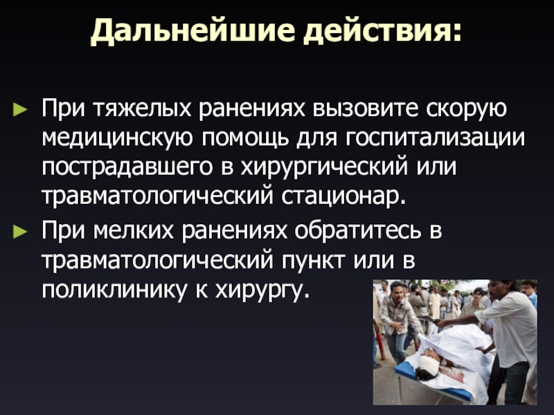 Дальнейшие действия:  При тяжелых ранениях вызовите скорую медицинскую помощь для госпитализации пострадавшего в хирургический или травматологический