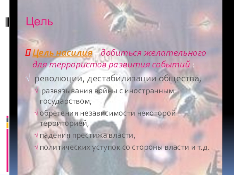 Цель насилия – добиться желательного для террористов развития событий :