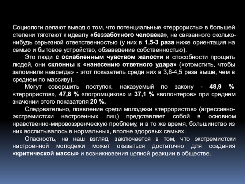 Слайд 28Социологи делают вывод о том, что потенциальные «террористы» в большей степени