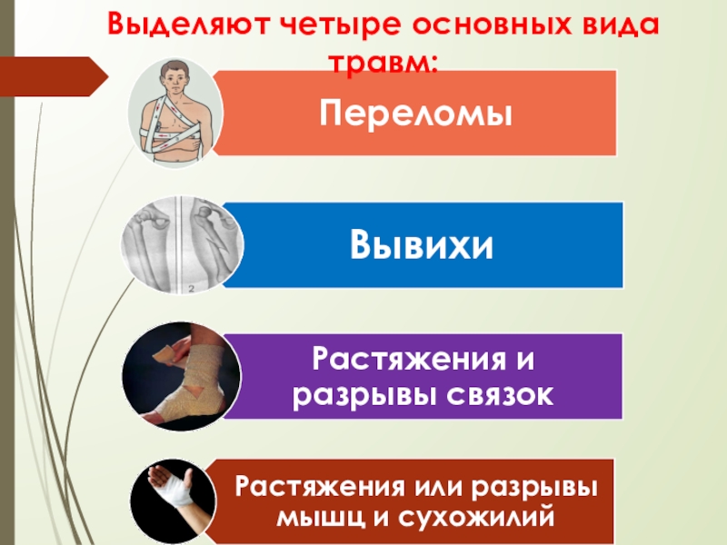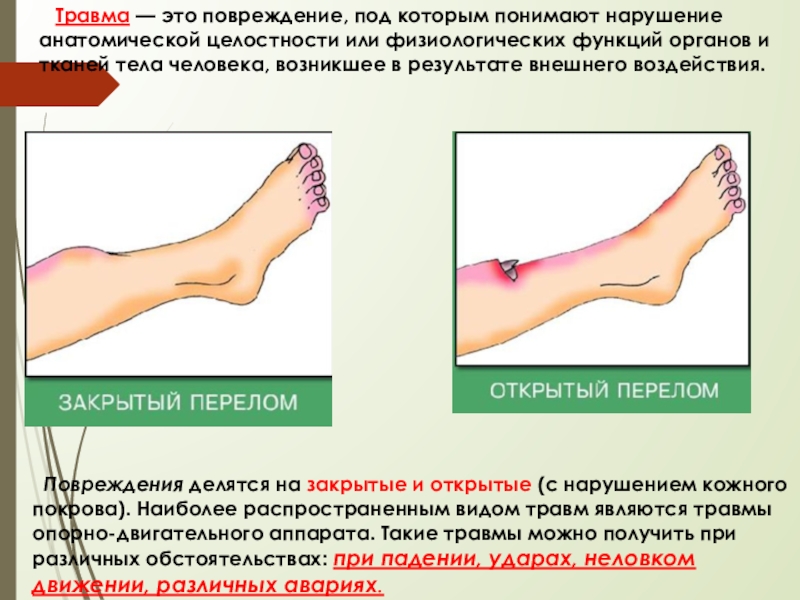 Повреждения делятся на закрытые и открытые (с нарушением кожного покрова). Наиболее распространенным видом травм являются травмы опорно-двигательного аппарата. Такие травмы можно получить при различных обстоятельствах: при падении, ударах, неловком движении, различных авариях.