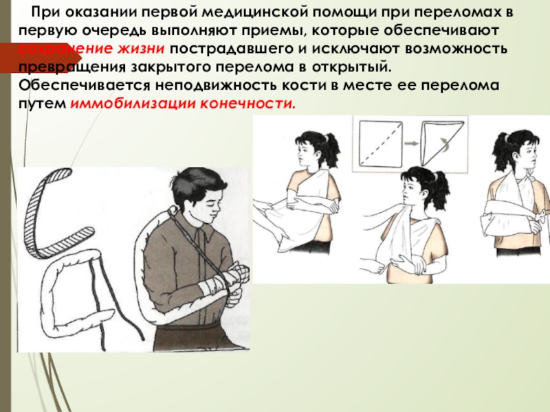 Основные признаки переломов: боль, припухлость, кровоподтек и нарушение подвижности конечности. При открытых переломах в ране могут быть видны отломки костей. Перелом, как правило, сопровождается кровотечением. Особенно опасно артериальное.
