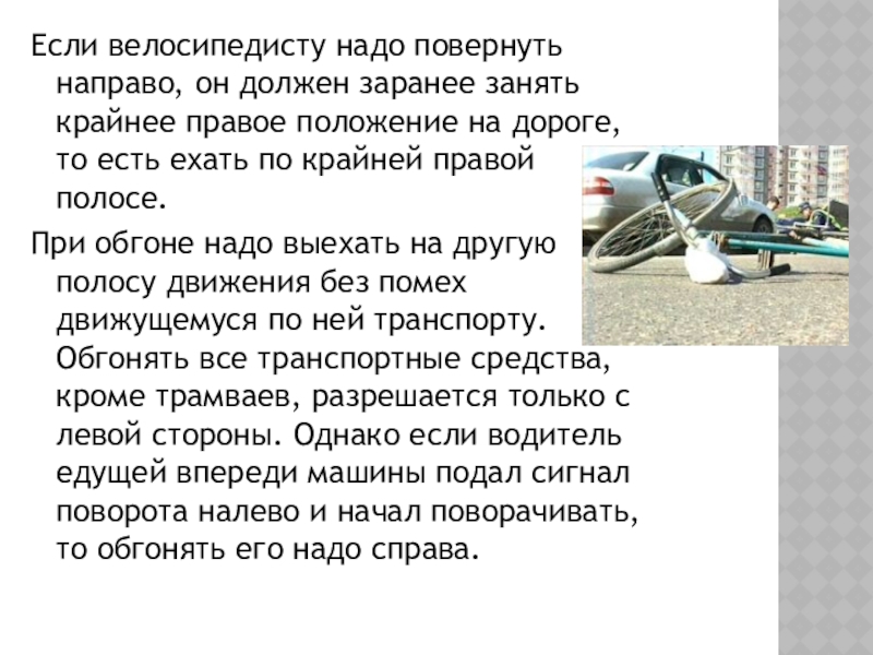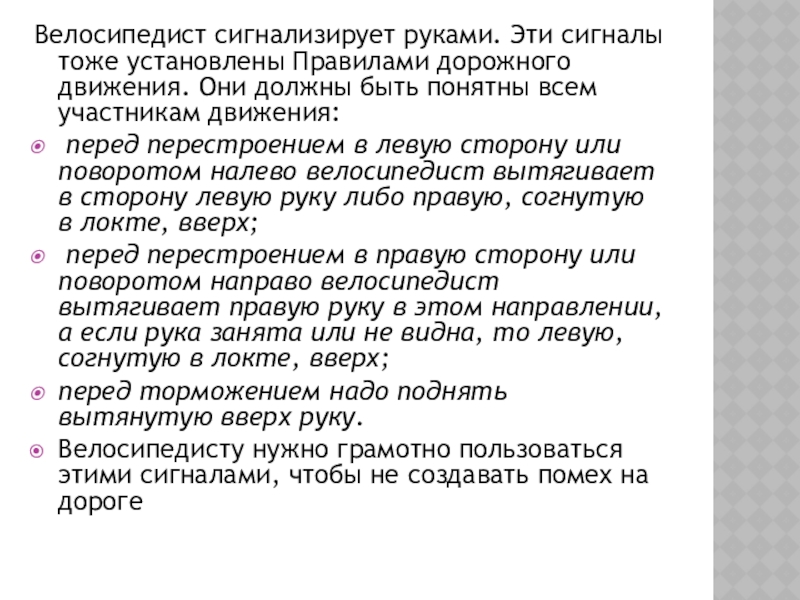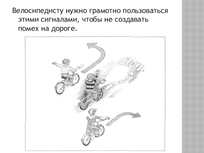 Слайд 15Велосипедисту нужно грамотно пользоваться этими сигналами, чтобы не создавать помех на