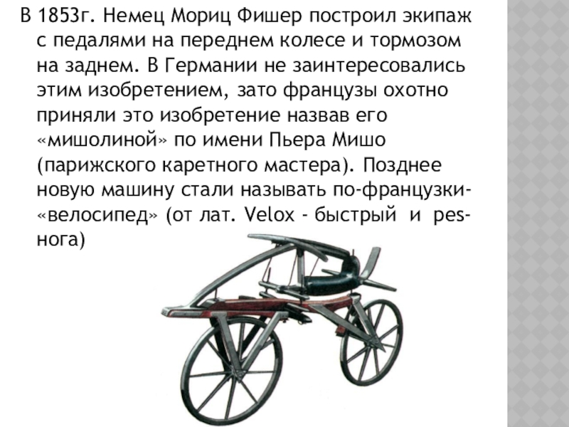 Слайд 5В 1853г. Немец Мориц Фишер построил экипаж с педалями на переднем