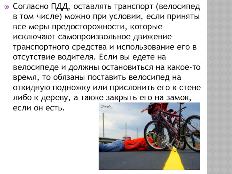 Слайд 24Согласно ПДД, оставлять транспорт (велосипед в том числе) можно при условии,