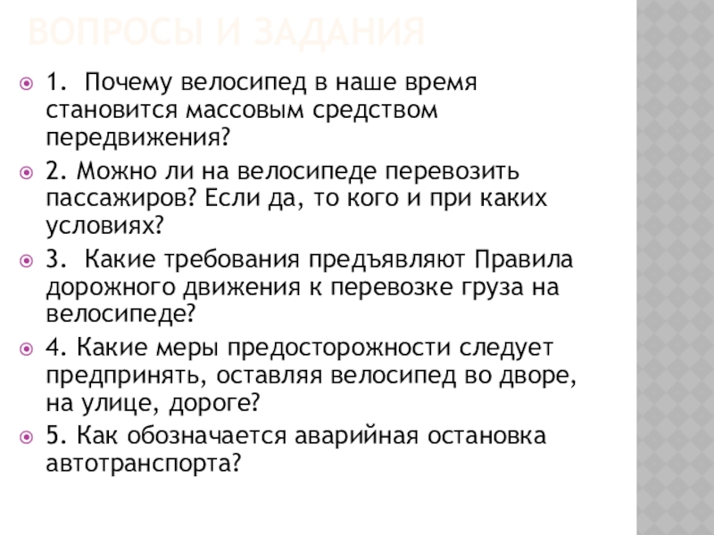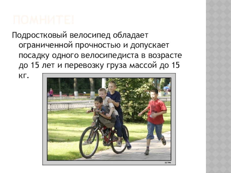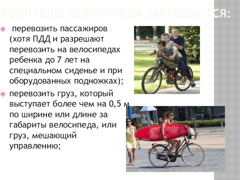 Слайд 21 перевозить пассажиров (хотя ПДД и разрешают перевозить на велосипедах ребенка