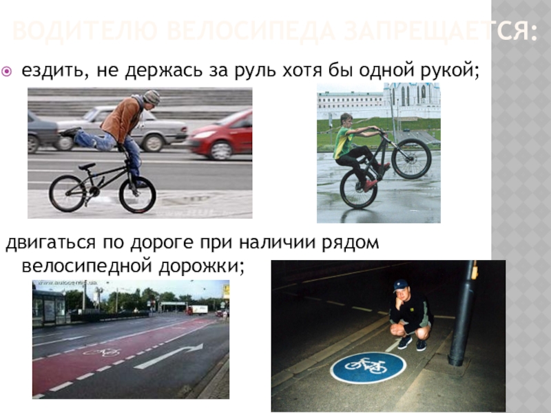 Слайд 22ВОДИТЕЛЮ ВЕЛОСИПЕДА ЗАПРЕЩАЕТСЯ: