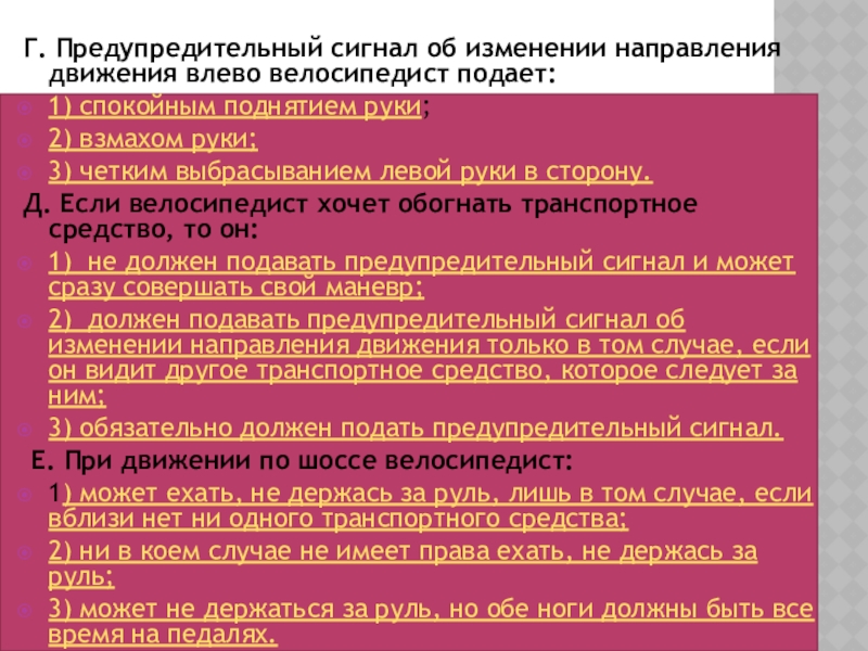 Д. Если велосипедист хочет обогнать транспортное средство, то он: