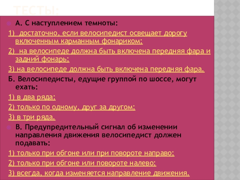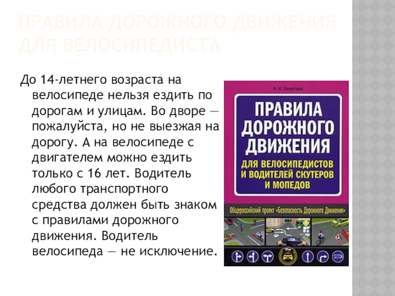 Слайд 12ПРАВИЛА ДОРОЖНОГО ДВИЖЕНИЯ ДЛЯ ВЕЛОСИПЕДИСТА