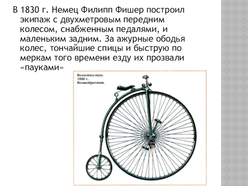 колесом, снабженным педалями, и маленьким задним. За ажурные ободья колес, тончайшие спицы и быструю по меркам того времени езду их прозвали «пауками»