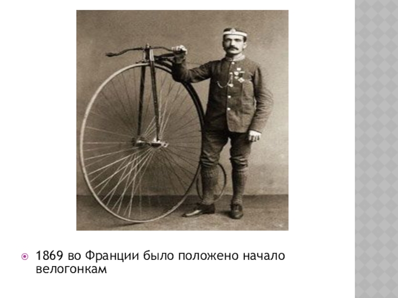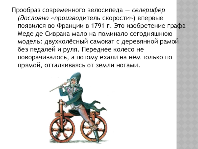 Франции в 1791 г. Это изобретение графа Меде де Сиврака мало на поминало сегодняшнюю модель: двухколёсный самокат с деревянной рамой без педалей и руля. Переднее колесо не поворачивалось, а потому ехали на нём только по прямой, отталкиваясь от земли ногами.