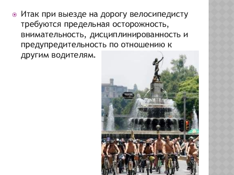 Слайд 25Итак при выезде на дорогу велосипедисту требуются предельная осторожность, внимательность, дисциплинированность