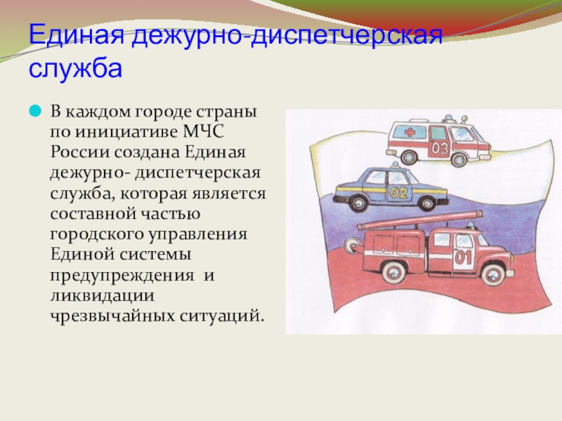 Единая дежурно- диспетчерская служба, которая является составной частью городского управления Единой системы предупреждения и ликвидации чрезвычайных ситуаций.