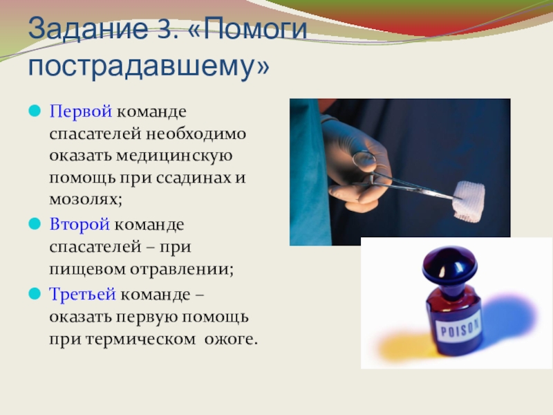 Слайд 11Задание 3. «Помоги пострадавшему»
