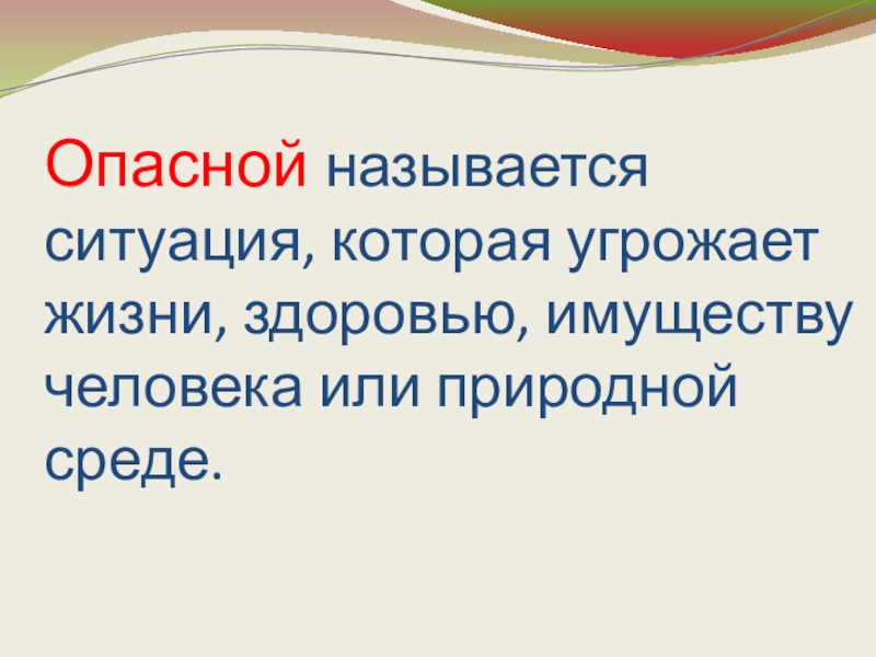 Слайд 2Опасной называется ситуация, которая угрожает жизни, здоровью, имуществу человека или природной