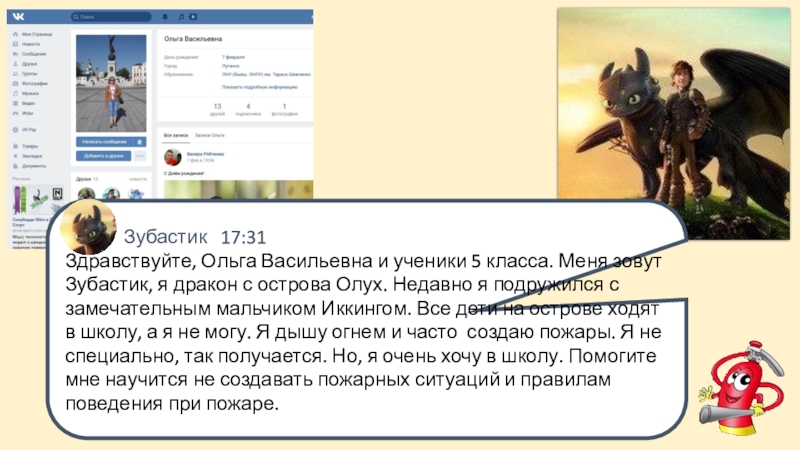 Васильевна и ученики 5 класса. Меня зовут Зубастик, я дракон с острова Олух. Недавно я подружился с замечательным мальчиком Иккингом. Все дети на острове ходят в школу, а я не могу. Я дышу огнем и часто создаю пожары. Я не специально, так получается. Но, я очень хочу в школу. Помогите мне научится не создавать пожарных ситуаций и правилам поведения при пожаре.