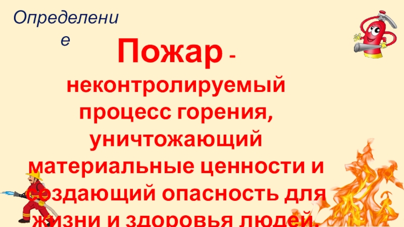 Слайд 10Пожар - неконтролируемый процесс горения, уничтожающий материальные ценности и создающий опасность