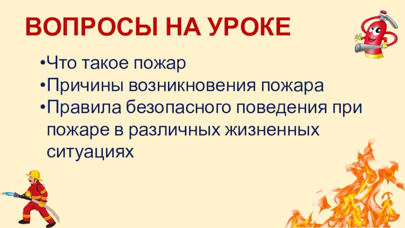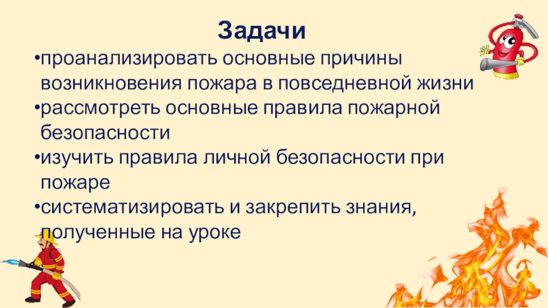 учить правильным действиям в случае пожара в доме, в лифте, на балконе и в школе; правилам эвакуации из горящего здания; умению использовать подручные средства пожаротушения; прививать навыки осторожного обращения с огнем.