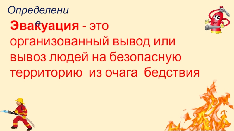 Слайд 20Эвакуация - это организованный вывод или вывоз людей на безопасную территорию