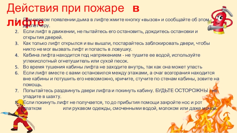 Во время тушения кабины лифта не заходите внутрь, так как она может упасть