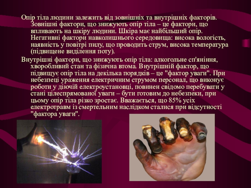 що знижують опір тіла – це фактори, що впливають на шкіру людини. Шкіра має найбільший опір. Негативні фактори навколишнього середовища: висока вологість, наявність у повітрі пилу, що проводить струм, висока температура (підвищене виділення поту).
