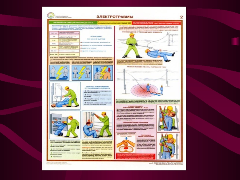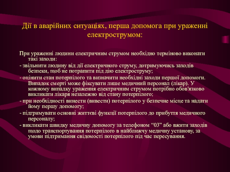 Слайд 13Дії в аварійних ситуаціях, перша допомога при ураженні електрострумом: