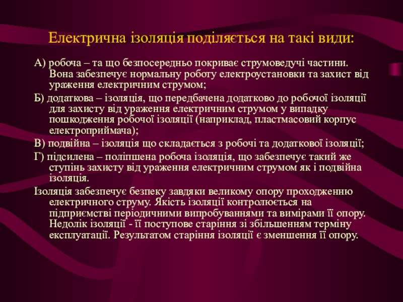 Слайд 7Електрична ізоляція поділяється на такі види: