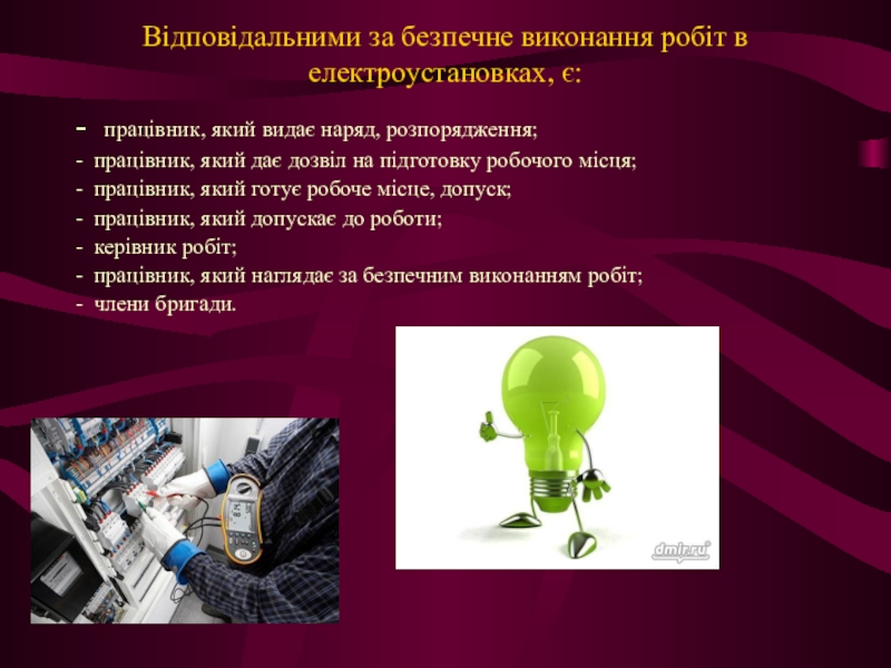 Слайд 3Відповідальними за безпечне виконання робіт в електроустановках, є:
