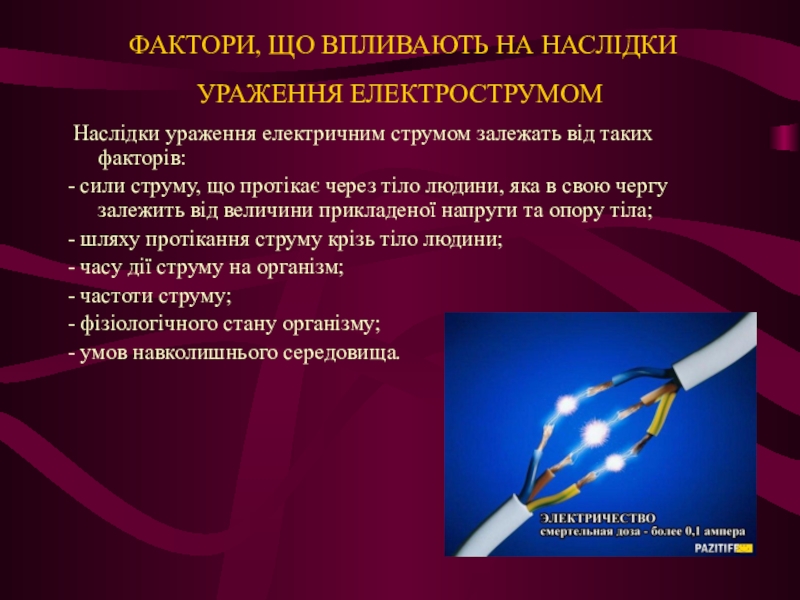 Слайд 9 ФАКТОРИ, ЩО ВПЛИВАЮТЬ НА НАСЛІДКИ УРАЖЕННЯ ЕЛЕКТРОСТРУМОМ