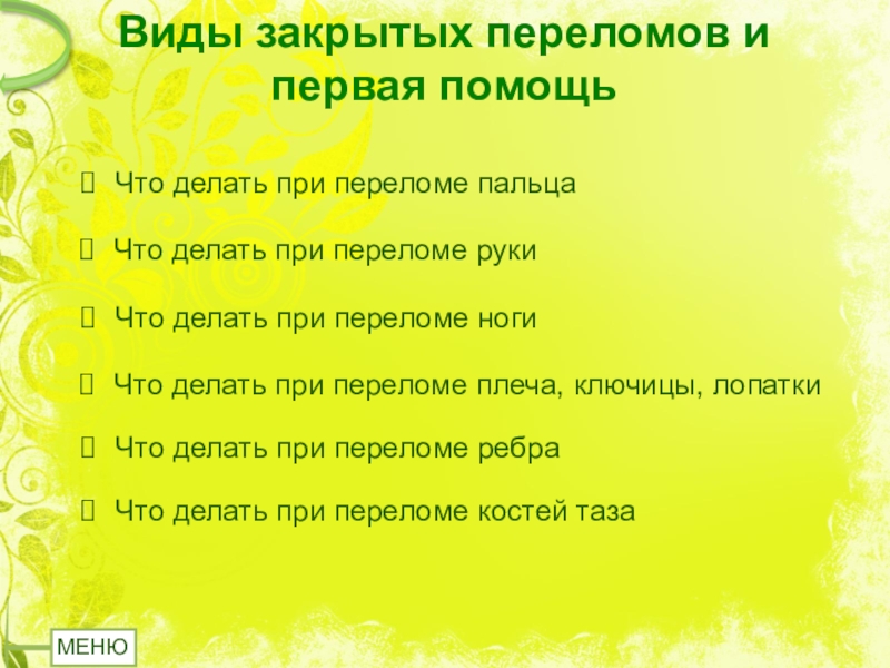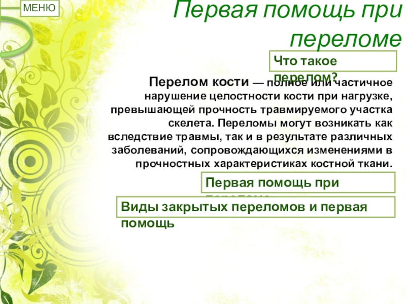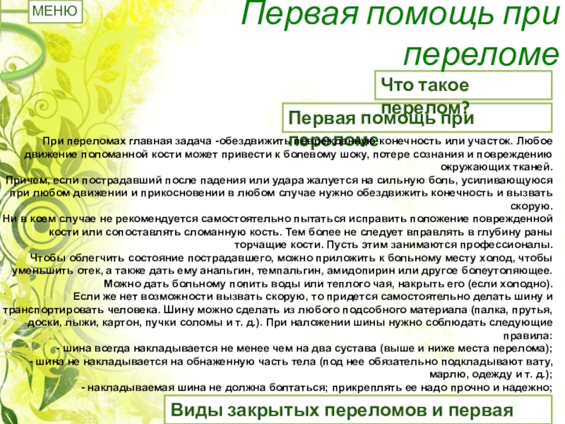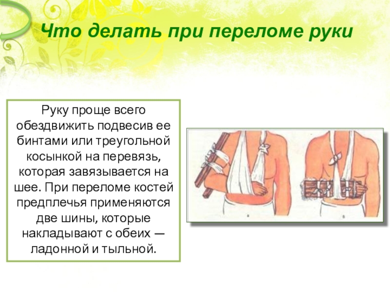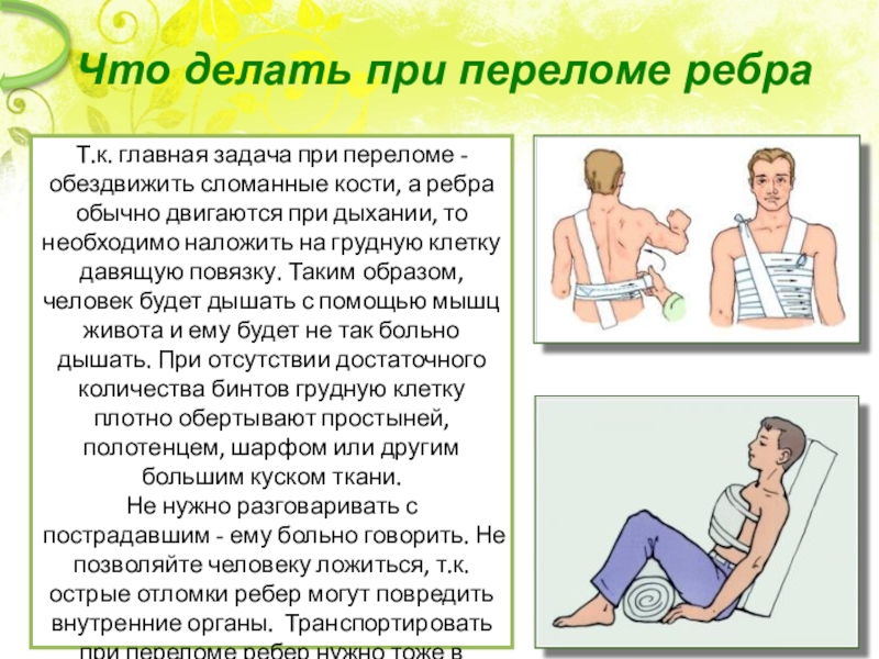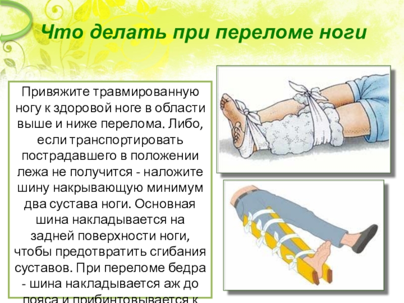 При переломах главная задача -обездвижить поврежденную конечность или участок. Любое движение поломанной кости может привести к болевому шоку, потере сознания и повреждению окружающих тканей.