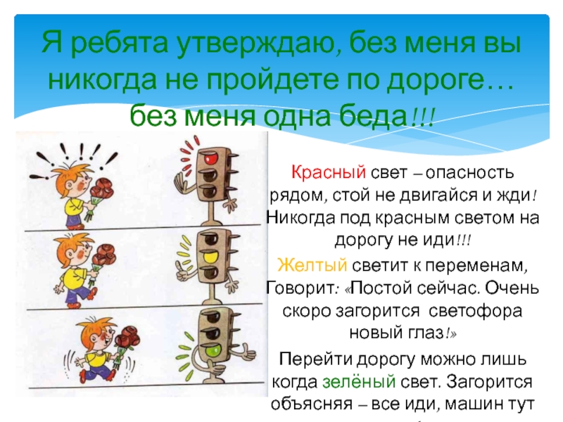 Красный свет – опасность рядом, стой не двигайся и жди! Никогда под красным светом на дорогу не иди!!!