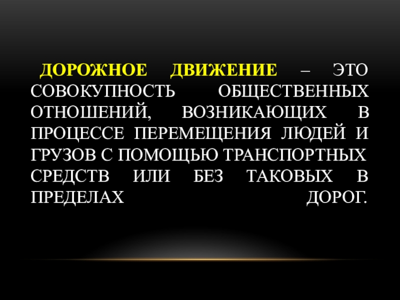 Слайд 6ДОРОЖНОЕ ДВИЖЕНИЕ – ЭТО СОВОКУПНОСТЬ ОБЩЕСТВЕННЫХ ОТНОШЕНИЙ, ВОЗНИКАЮЩИХ В ПРОЦЕССЕ ПЕРЕМЕЩЕНИЯ