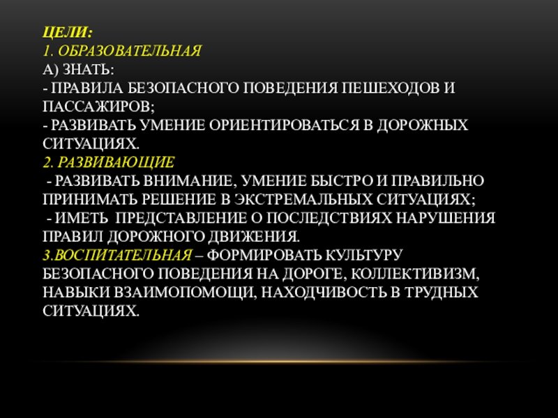 3.ВОСПИТАТЕЛЬНАЯ – ФОРМИРОВАТЬ КУЛЬТУРУ БЕЗОПАСНОГО ПОВЕДЕНИЯ НА ДОРОГЕ, КОЛЛЕКТИВИЗМ, НАВЫКИ ВЗАИМОПОМОЩИ, НАХОДЧИВОСТЬ В ТРУДНЫХ СИТУАЦИЯХ.