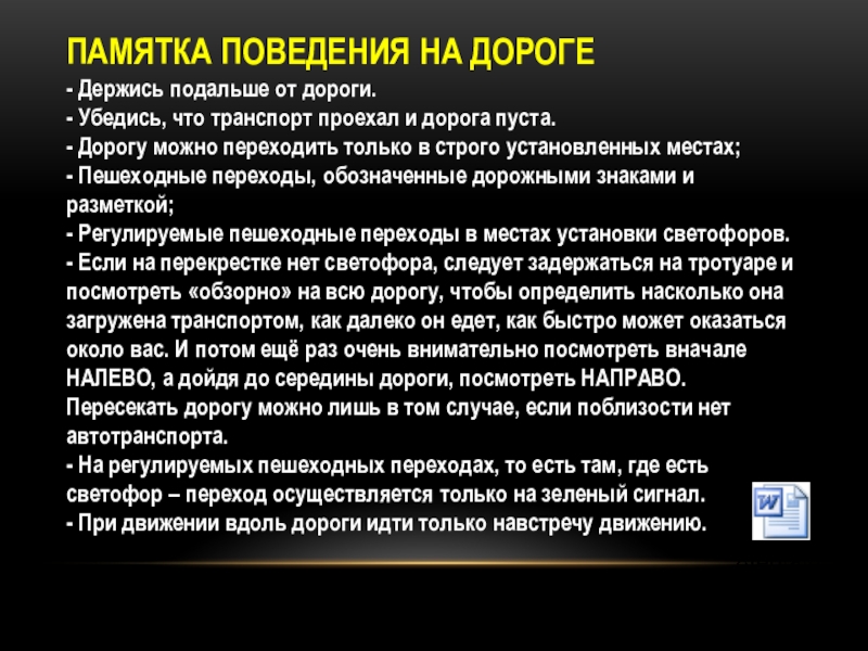Слайд 13ПАМЯТКА ПОВЕДЕНИЯ НА ДОРОГЕ