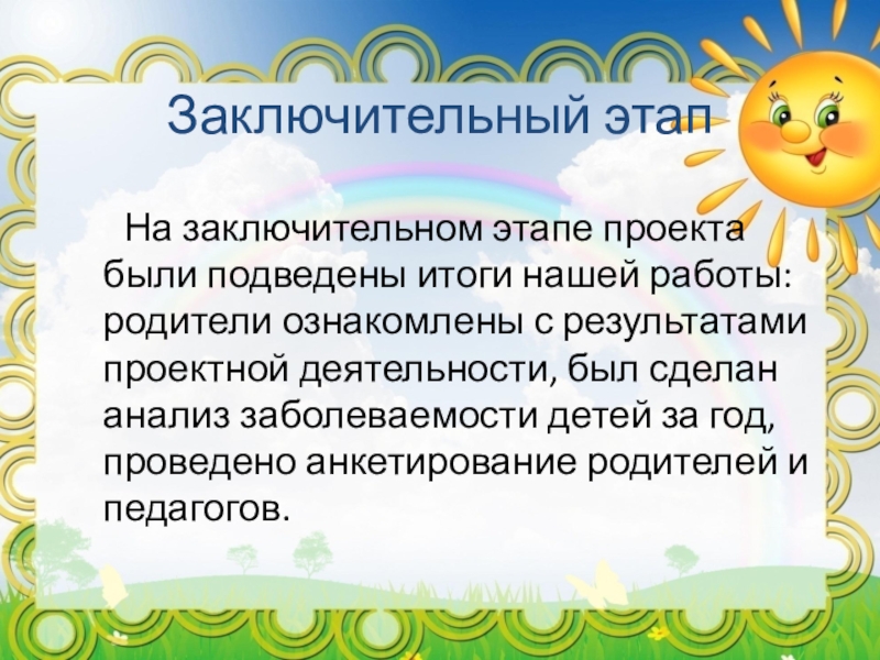 нашей работы: родители ознакомлены с результатами проектной деятельности, был сделан анализ заболеваемости детей за год, проведено анкетирование родителей и педагогов.