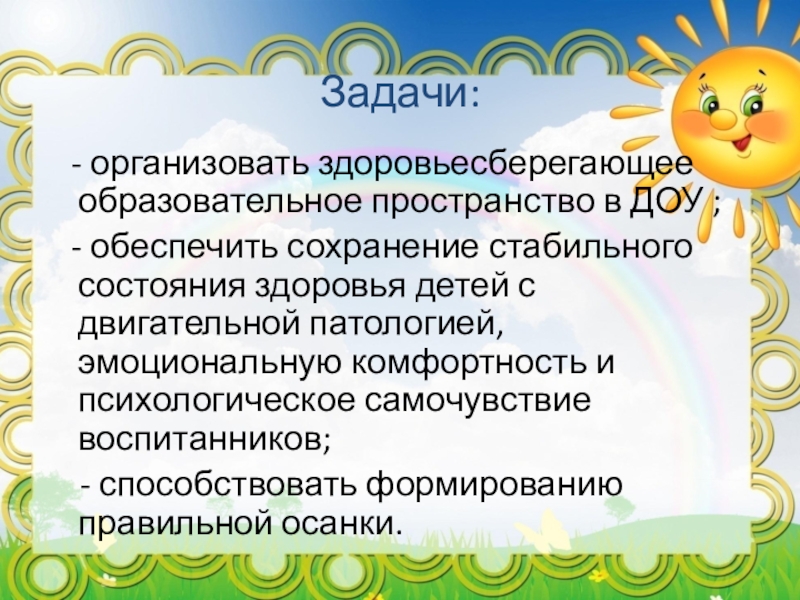 - обеспечить сохранение стабильного состояния здоровья детей с двигательной патологией, эмоциональную комфортность и психологическое самочувствие воспитанников;